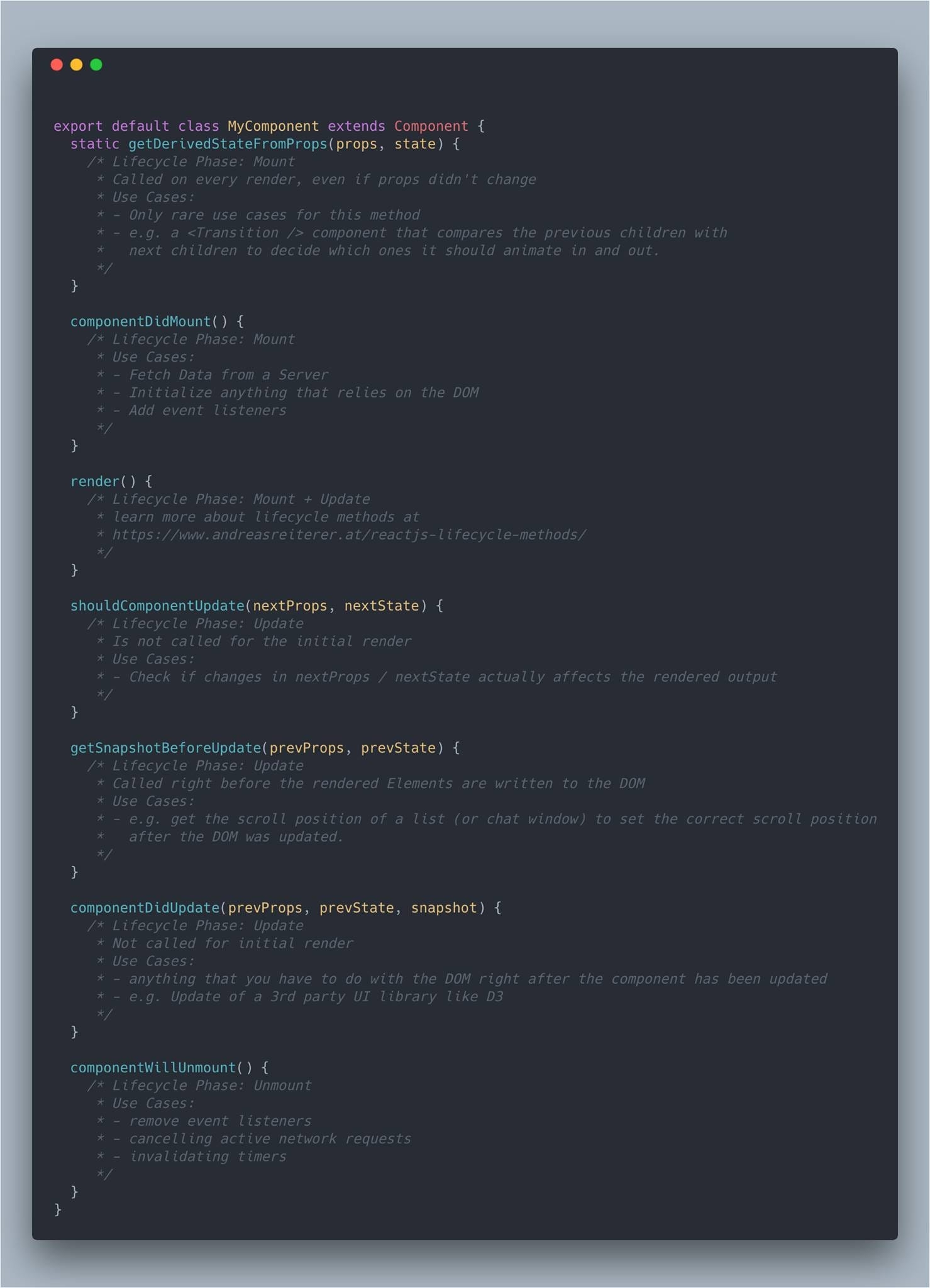 They are componentDidMount, componentWillMount, componentWillUpdate, componentDidUpdate, shouldComponentUpdate and componentWilReceiveProps.