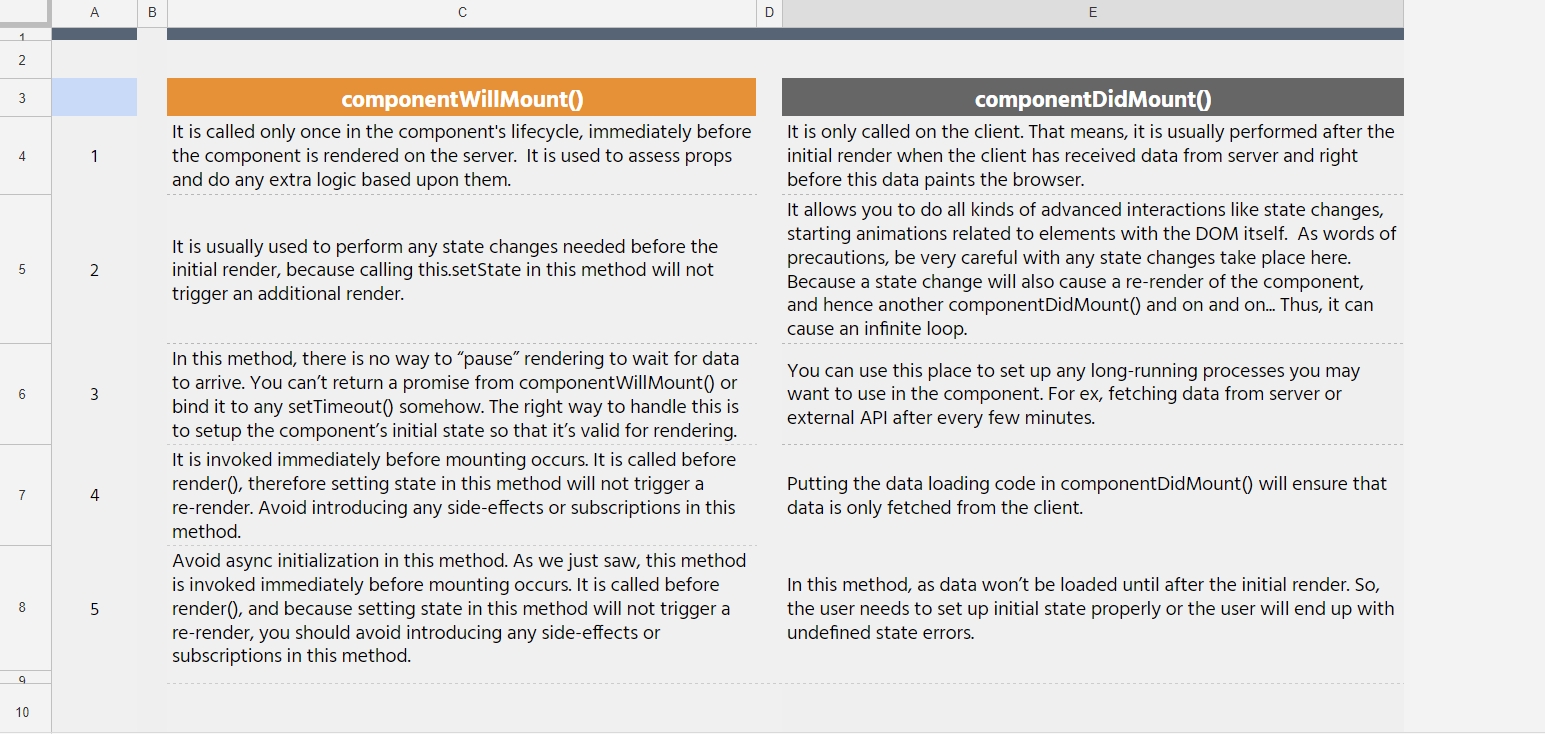 understanding difference between componentDidMount() and componentWillMount() methods. Now that I understand the difference, here is for anyone need little more clarity on these two methods:componentWillMount() v/s componenetDidMount() — React
