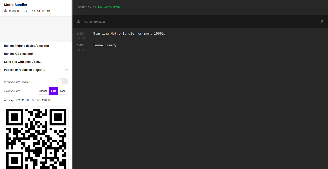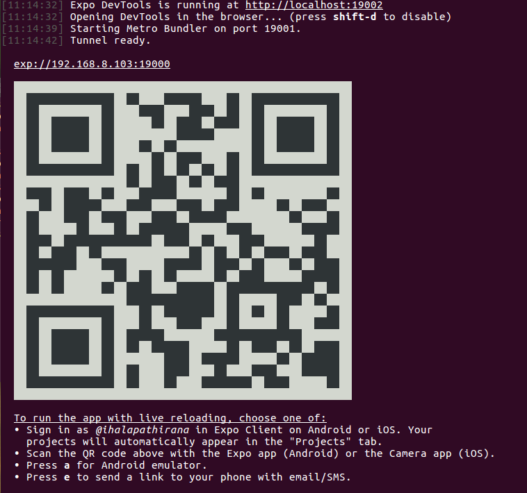 Then the server starts and you can see QR code in both browser and terminal Expo dev tools running on a browser