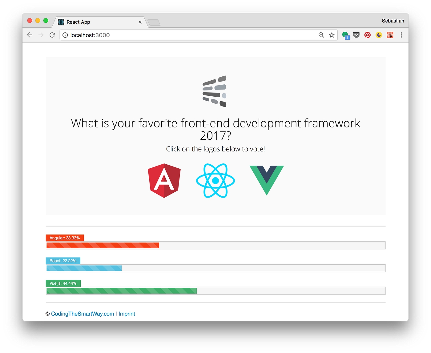 The application is giving the user the option to vote for his favorite front-end framework by clicking on the logos. The vote count is stored in the application store and updated every time the user votes. The voting result is displayed below by a separate React component. The component accesses to store to get the current voting values for each framework. Let’s get started!