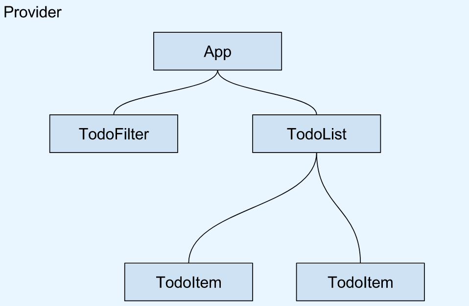 If we were to follow the previous diagram, the Provider node would be represented as a parent node on top of the App node. However, because of the utility that Provider gives us, I feel it’s more appropriate to represent it as something which “wraps” the entire application building blocks look like this.