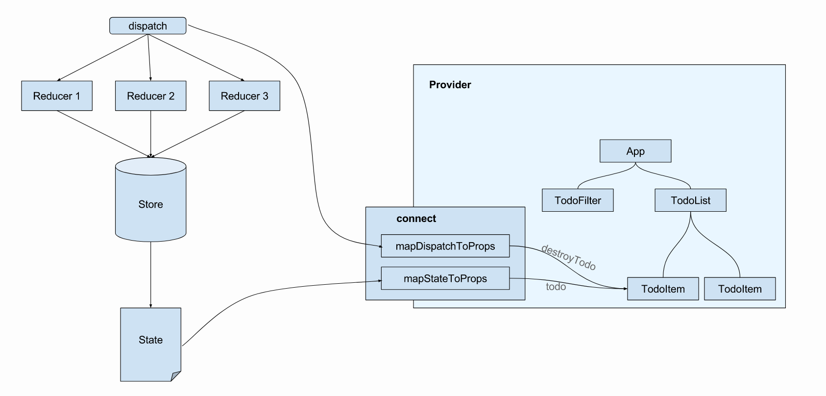 In this case, mapStateToProps returns an object with only one key : “todo”, and mapDispatchToProps returns an object with the destroyTodo key.